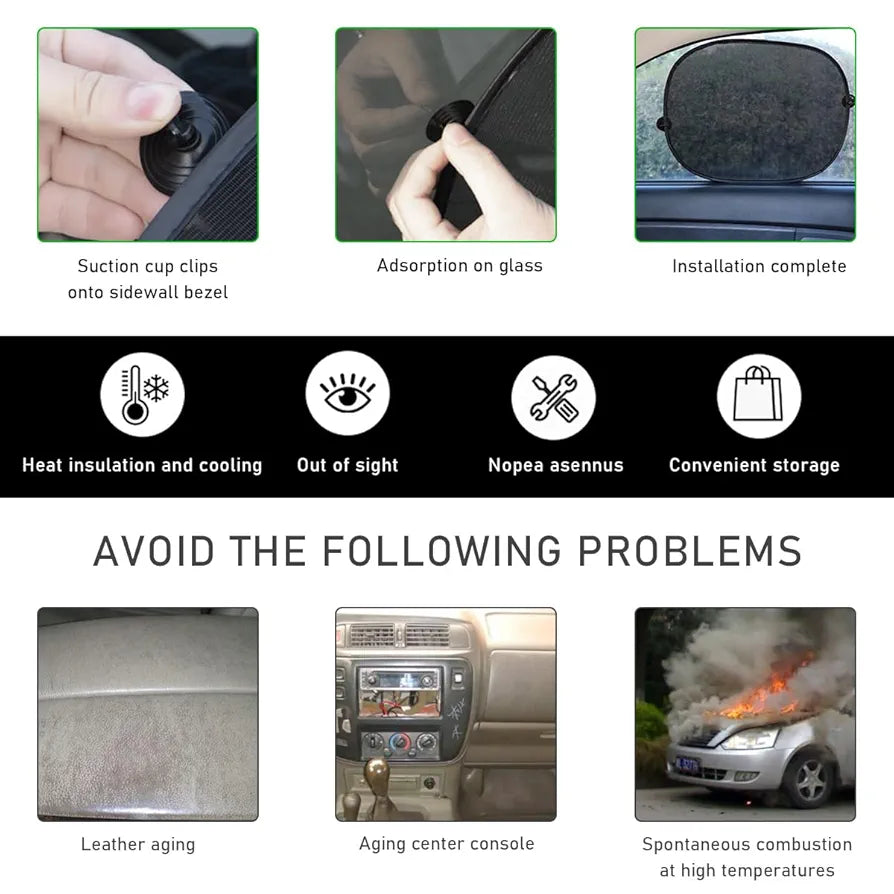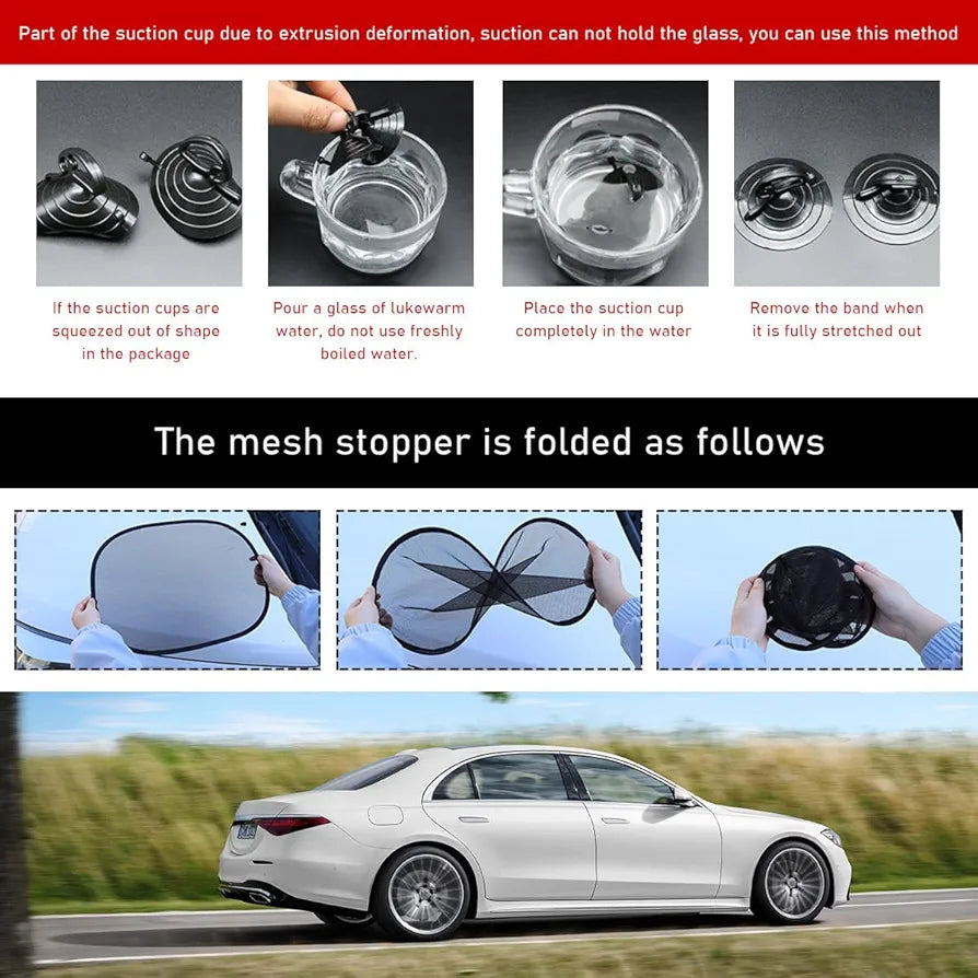 【Easy Installation】: All you need to do is clip the suction cups to the edge of the sunshade and attach the suction cups to your car window glass to start using this sunshade. There is no need to use any other tools and it won't leave adhesive marks on your car windows.